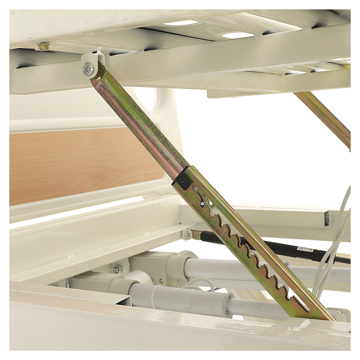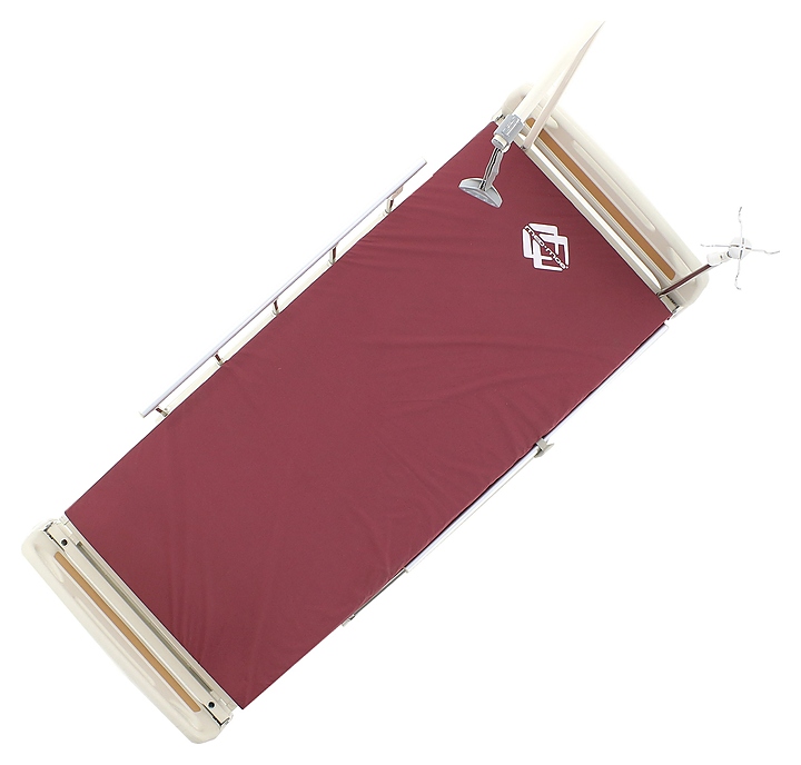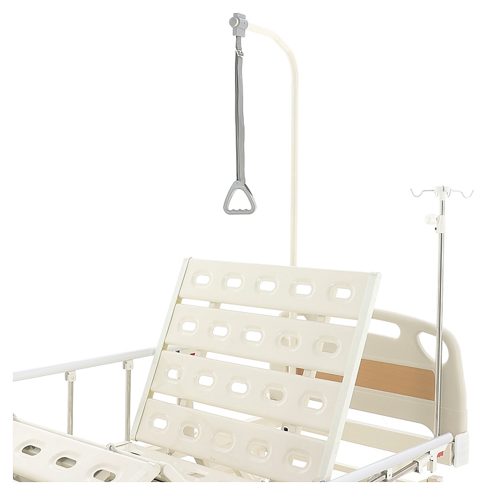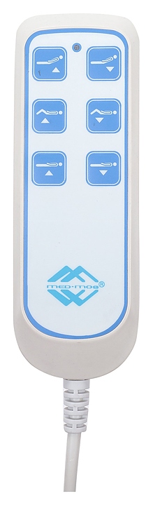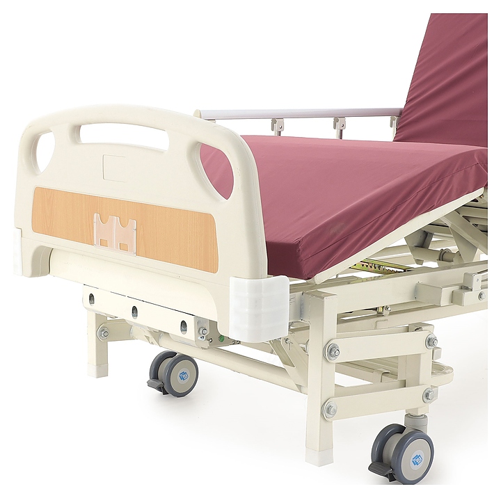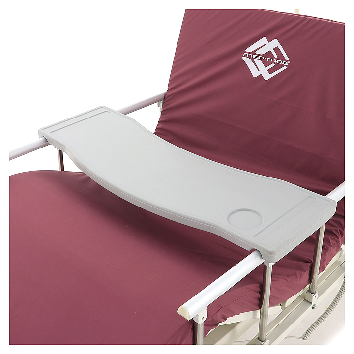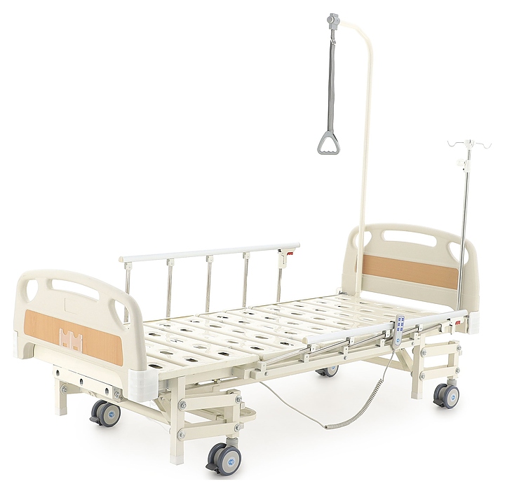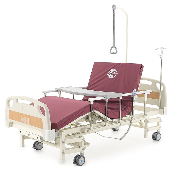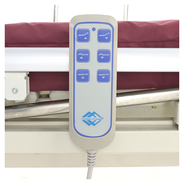 Медицинская кровать электрическая Med-Mos DB-6 (MЕ-3018Н-02) с РУ используется в учреждениях здравоохранения для более комфортного пребывания в больнице лежачих больных с проблемами опорно-двигательного аппарата и пациентов, которые проходят процесс реабилитации после перенесенных операций или тяжелых заболеваний. Модель оснащена карманом из прозрачного пластика для карточки пациента на ножной спинке, пластиковыми заглушками на боковых ограждениях и индикаторами режимов работы на пульте управления пациента. Ложе, каркас и боковые ограждения выполнены из сварных конструкций из профильных труб из высокопрочной стали, покрытой ударопрочной эпоксидной эмалью, торцевые спинки - из ABS-пластика с декоративной пленкой, опорные стойки - из нержавеющей стали, поручни - из алюминиевого сплава, заглушки - из пластика, шины колес - из полиуретана, инфузионная стойка и дуга для подтягивания - из нержавеющей стали с элементами из пластика, рукояти привода - из пластика, столик - из ударо-термостойкого пластика. Матрас в комплект поставки не входит и приобретается отдельно. Кровать поставляется с регистрационным удостоверением Минздрава РФ. Комплектация: