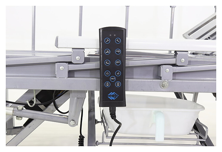 Медицинская кровать электрическая Med-Mos YG-3 (МЕ-5228Н-11) с РУ используется в учреждениях здравоохранения для более комфортного пребывания в больнице лежачих больных с проблемами опорно-двигательного аппарата и пациентов, которые проходят процесс реабилитации после перенесенных операций или тяжелых заболеваний. Модель оснащена пластиковыми заглушками на опорных стойках и пультом управления пациента. Ложе, каркас, опоры и боковые ограждения выполнены из сварных конструкций из профильных труб из высокопрочной стали, покрытых ударопрочной эпоксидной эмалью, торцевые спинки - из ЛДСП, колеса - из полиуретана, дуга для подтягивания и инфузионная стойка - из нержавеющей стали с элементами из пластика, матрас - из ПВХ. Кровать поставляется с регистрационным удостоверением Минздрава РФ. Комплектация: