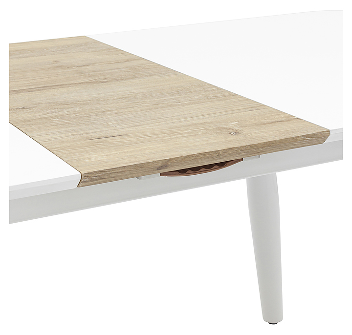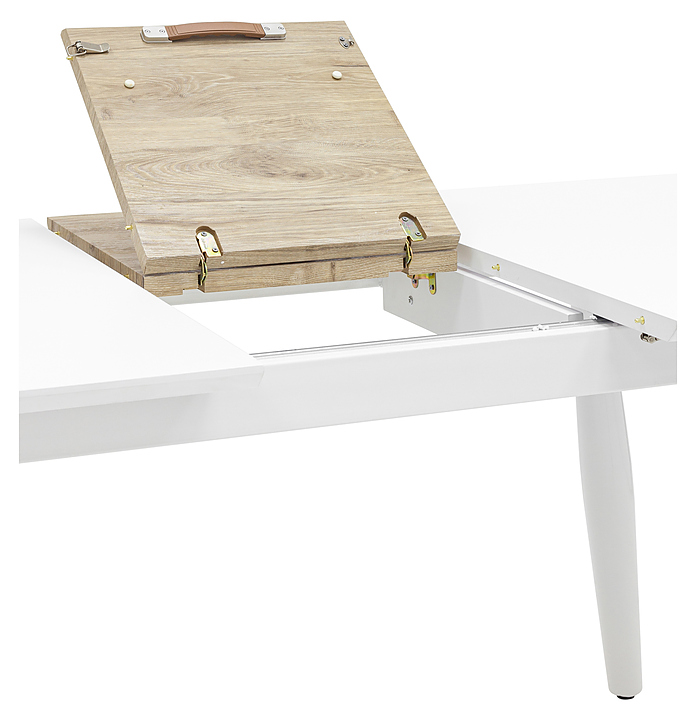 Обеденный стол Stool Group Чикаго раскладной 120-160*90 белый предназначен для использования на даче, дома, для кухни, а также в кафе и ресторанах. Модель выполнена в стиле минимализма. Столешница изготовлена из МДФ, ножки - из металла, покрашены в цвет светлого дерева, дополнительная вкладка из МДФ с бумажным шпоном цвета беленого дуба. Особенности: