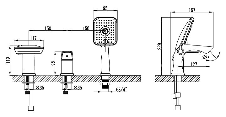 Смеситель для ванны и душа LEMARK Unit LM4545C встраиваемый на борт ванны, 3 отверстия, хром