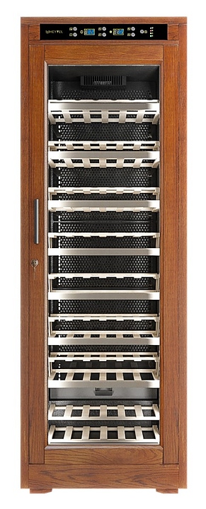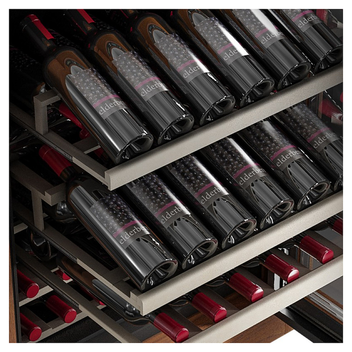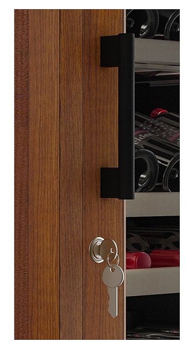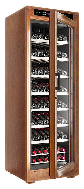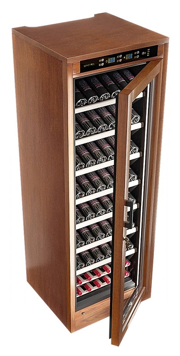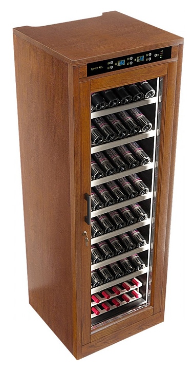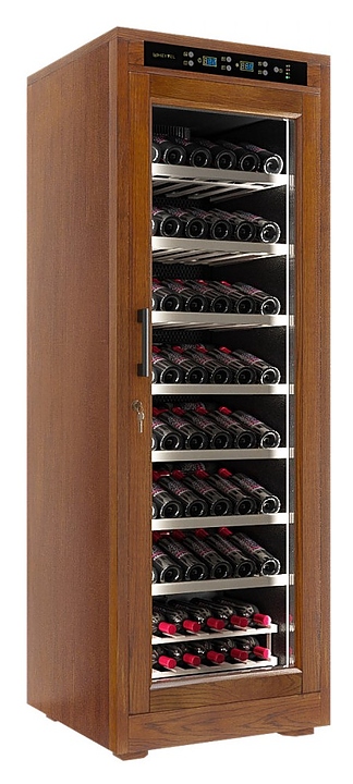 Винный шкаф MEYVEL MV108-WN1-M предназначен для демонстрации, хранения и создания оптимальных условий для сохранения всех вкусовых свойств вина в бутылках на предприятиях общественного питания, торговли, в барах, ресторанах, специализированных магазинах, частных домах или квартирах. Модель оснащена сенсорной панелью управления, электронным термостатом и светодиодной подсветкой. Корпус выполнен из обшитой деревом стали, дверь - из деревянной рамы и двойного стекла с защитой от ультрафиолетовых лучей, полки - из массива бука, ручка двери - черного цвета. Особенности:
