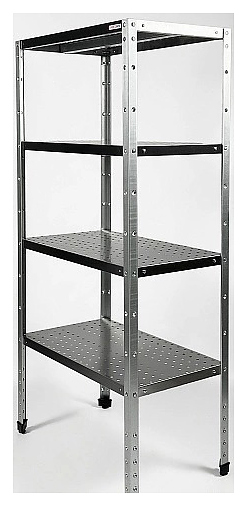 Кухонный стеллаж Restoinox СТПП-13/7-ЭЦ предназначен для хранения посуды, инвентаря и продуктов, не требующих специального температурного режима, на предприятиях общественного питания и торговли. Модель оснащена 4 регулируемыми по высоте перфорированными полками и ребрами жесткости. Разборный каркас выполнен из уголка 40х40 мм оцинкованной стали, ребра жесткости и полки - из нержавеющей стали AISI 430. Дополнительные характеристики: