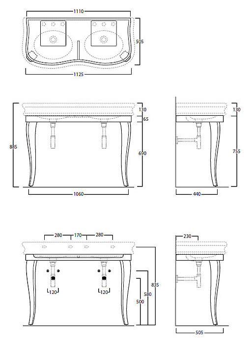 Раковина-консоль SIMAS Lante 120 LA12bi*1 120х54 см, две раковины, два отв. под смеситель, керамика, белый