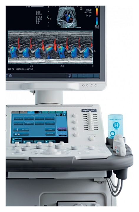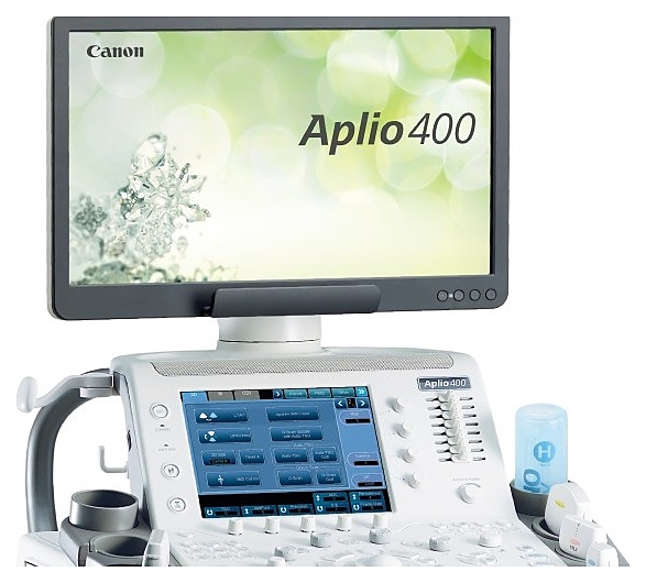 Аппарат УЗИ Canon Aplio 400 используется в различных учреждениях здравоохранения для проведения ультразвуковой диагностики, то есть получения информации о расположении, форме, размере, структуре, кровоснабжении органов и тканей человека. Модель оснащена большим, цветным экраном Touch Screen. Особенности: