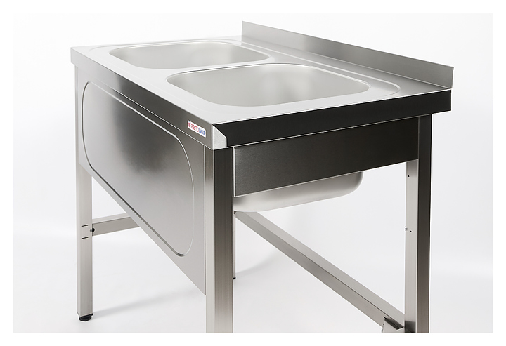 Моечная ванна Restoinox ВМЦ-2/11/6-Б используется на предприятиях общественного питания и торговли для мытья посуды, кухонного инвентаря и продуктов. Модель оснащена фартуком с 3-х сторон, регулируемыми по высоте пластиковыми опорами и бортом. Ножки выполнены из квадратной трубы 40х40 мм из нержавеющей стали Aisi 430, фартук - из нержавеющей стали Aisi 430, емкость - из нержавеющей стали Aisi 304. Особенности: