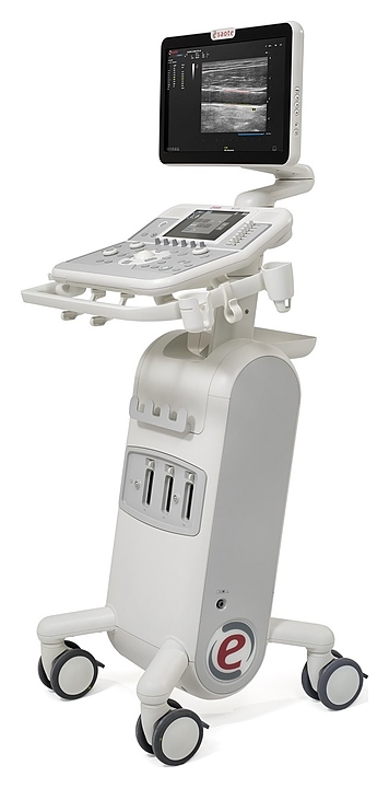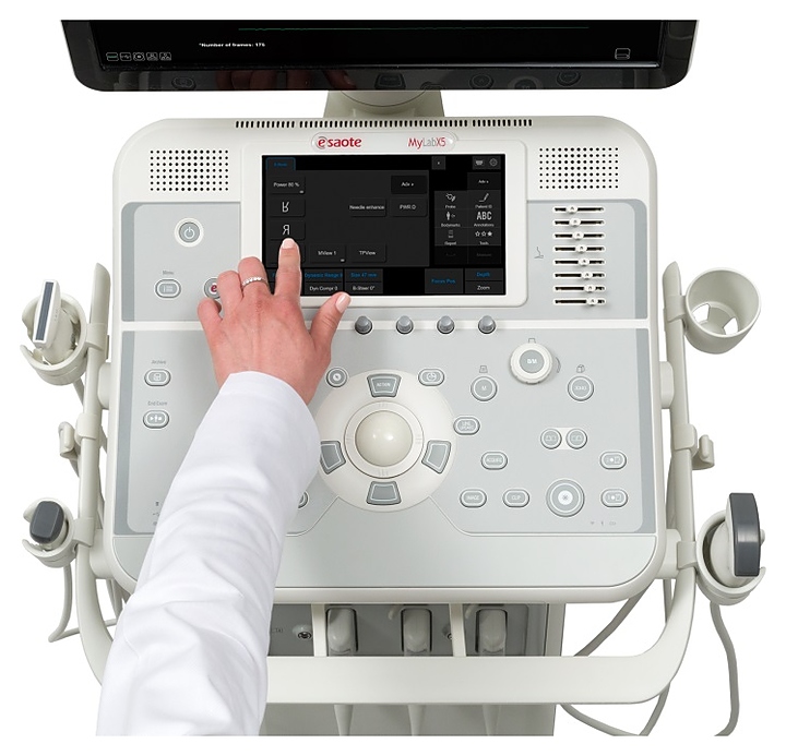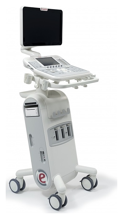 Аппарат УЗИ Esaote MyLab x5 используется в различных учреждениях здравоохранения, в том числе в частных кабинетах УЗД для проведения ультразвуковой диагностики, то есть получения информации о расположении, форме, размере, структуре, кровоснабжении органов и тканей человека. Модель оснащена большим, цветным жидкокристаллическим монитором высокого разрешения Full HD, дополнительным, емкостным, командным экраном с технологией Touch Screen, 3-мя одновременно активными портами для сканирующих датчиков, крупными колесами на тележке, и большим количеством диагностических программ. Датчики выполнены из активного матричного композиционного материала, нескольких адаптивных слоев и геометрической линзы Bi-con. В комплект поставки входит тележка. Особенности: