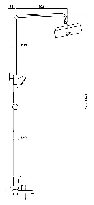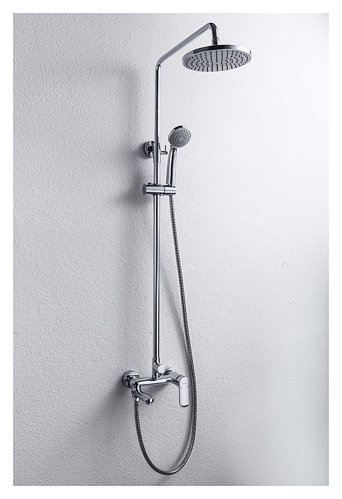 В комплект поставки входят переключатель потоков, душевая штанга, душевой шланг, верхняя душевая лейка, ручная лейка и держатель для душа.