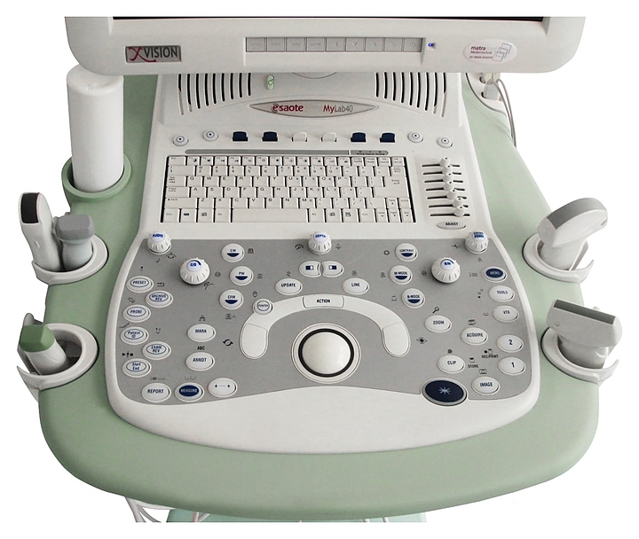 Аппарат УЗИ Esaote MyLab 40 используется в различных учреждениях здравоохранения, в том числе в частных кабинетах УЗД для проведения ультразвуковой диагностики, то есть получения информации о расположении, форме, размере, структуре, кровоснабжении органов и тканей человека. Модель оснащена большим, цветным жидкокристаллическим монитором высокого разрешения на свободно вращающемся кронштейне, и 3-мя активными портами для подключения датчиков. Особенности: