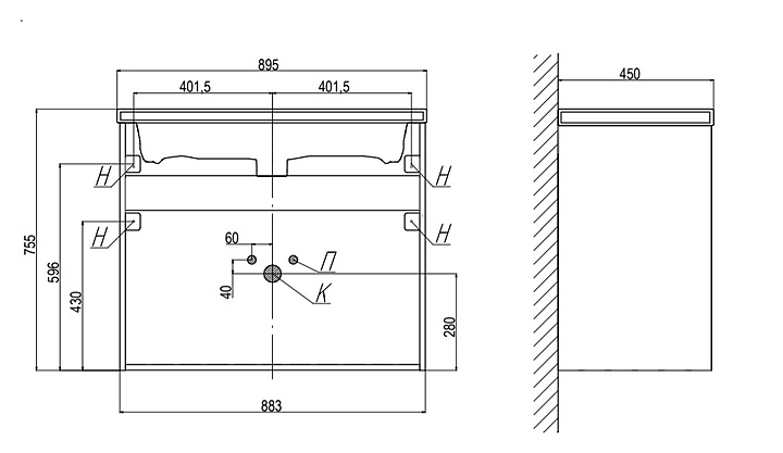 • Размеры тумбы с раковиной: 895х450х755 мм