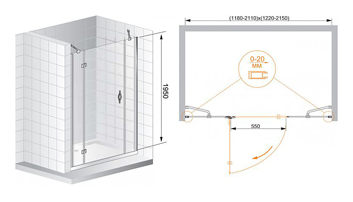 Дверь душевая CEZARES BERGAMO-W-B-13-60+60/60-P-Cr-L 180х195 см, в нишу, распашная