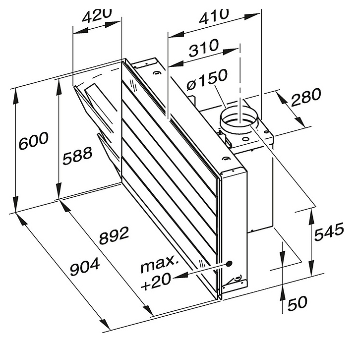 Размер Ширина 90 см Комбинация нержавеющей стали и высококачественного закалённого стекла Корпус вытяжки из матовой полированной стали Декоративная вытяжка для интеграции в стену за панелью конфорок