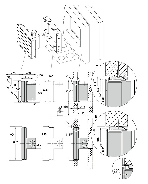 Монтажная рама DER 6000 всегда требуется для монтажа вытяжки DA 6000 W и поэтому должна обязательно включаться в заказ. Ее необходимо смонтировать в фальш-стене до установки самой вытяжки. ВНИМАНИЕ! Вытяжку DA 6000 W нельзя устанавливать над газовыми панелями конфорок.