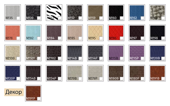 Модель доступна в альтернативном цветовом исполнении обивки экокожей категории Стандарт; белый № 89, слоновая кость № 90 категории Бизнес.