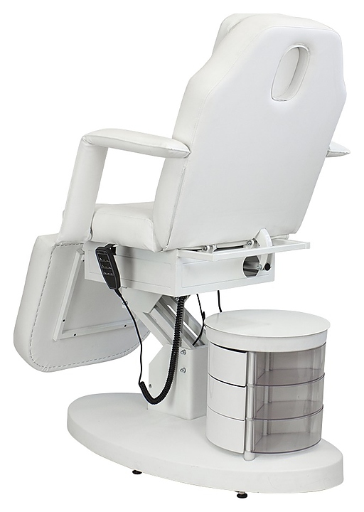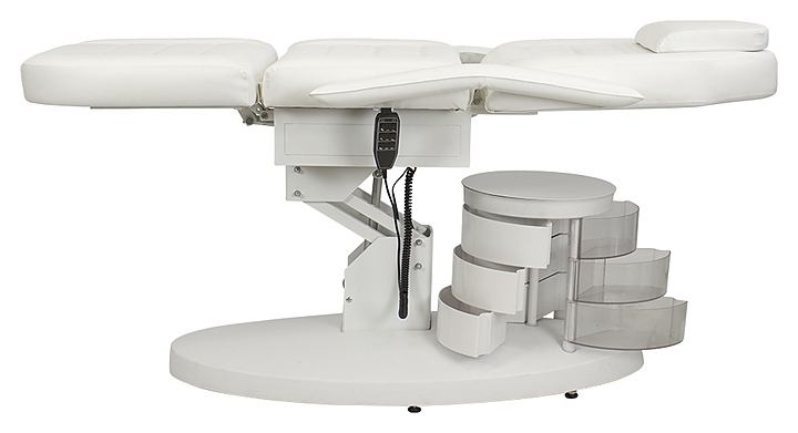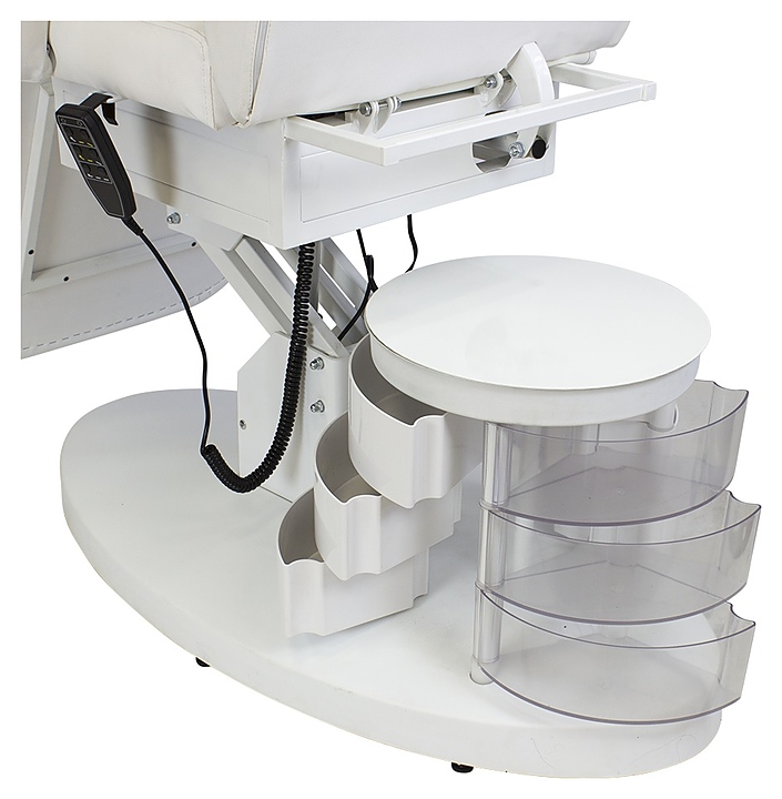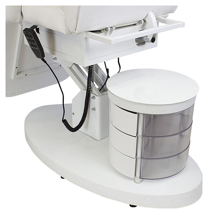 Косметологическое кресло МЭДИСОН GiroCo ELEGANSA с тумбой предназначено для комфортного размещения клиента при проведения процедур маникюра, педикюра, спа-процедур, косметического и лечебного массажа в салонах красоты и косметологических центрах. Модель оснащена устойчивым основанием, электроприводом с 3 моторами и пультом управления, вращающейся тумбой с 6 ящиками, удобным ложементом с мягкими сиденьем, спинкой с отверстием для лица, съемной подушкой-подголовником, ножной секцией и съемными подлокотниками. Обивка выполнена из качественной экокожи, каркас кресла – из металла с антикоррозийным покрытием и многослойной фанеры, основание – из металла и пластика, каркас тумбы – из металла, ящики тумбы – из пластика, наполнитель – эластичный пенополиуретан. Модель доступна в альтернативном цветовом исполнении обивки экокожей категории Стандарт. Особенности: