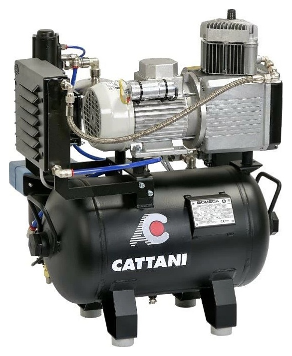 Компрессор Cattani на 1 установку используется в стоматологических кабинетах и клиниках для приведения в движение зубоврачебных приборов и устройств посредством чистого, безмасляного сжатого воздуха. Сжатый воздух, производимый компрессором, обеспечивает высокую степень соблюдения гигиены и качества труда стоматолога, не создавая вокруг себя среду, содержащую чужеродные вещества. Модель оснащена металлическим шумозащитным кожухом, осушителем абсорбционного типа, и системой фильтров и охлаждения. Наполнитель осушителя выполнен из силикагеля. Особенности: