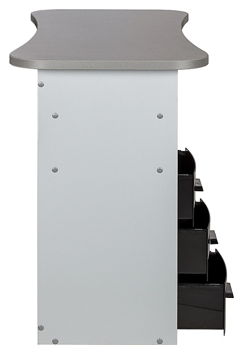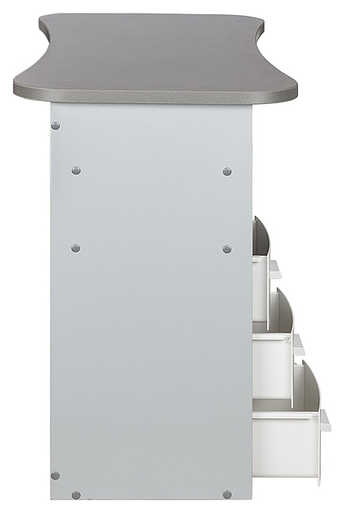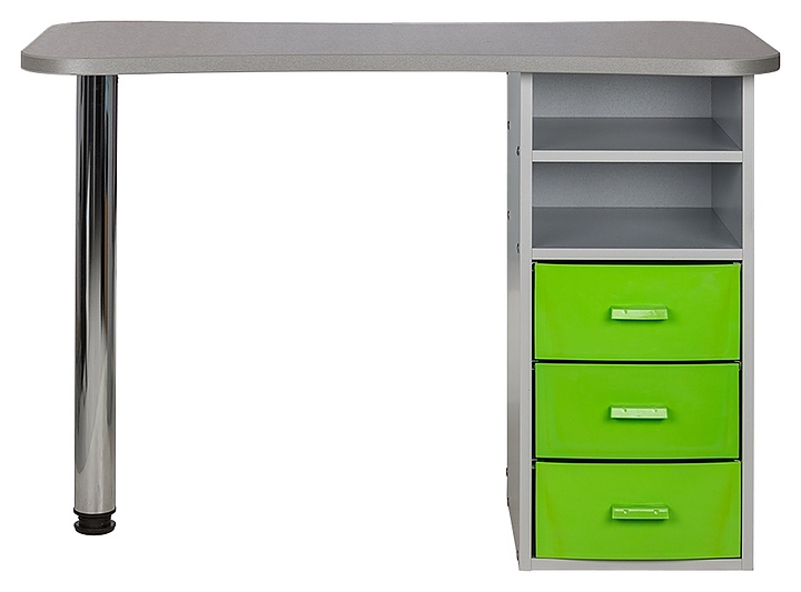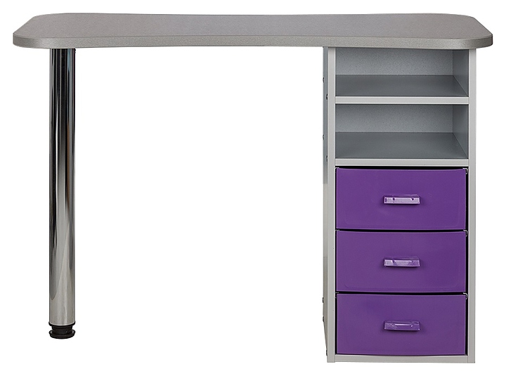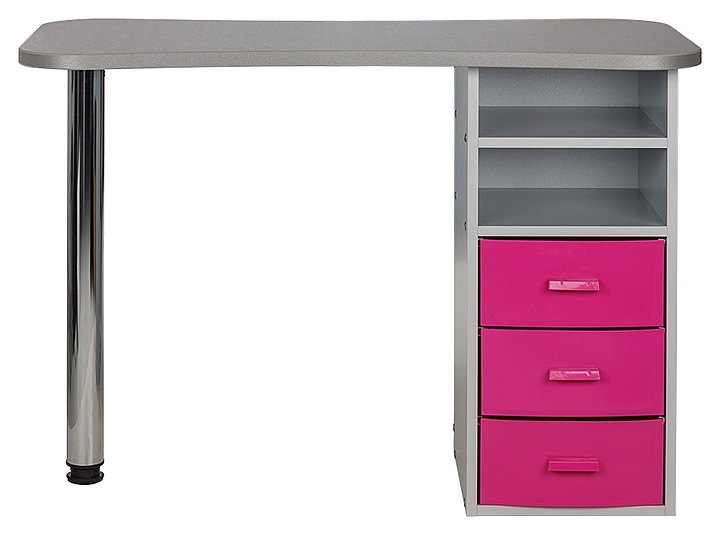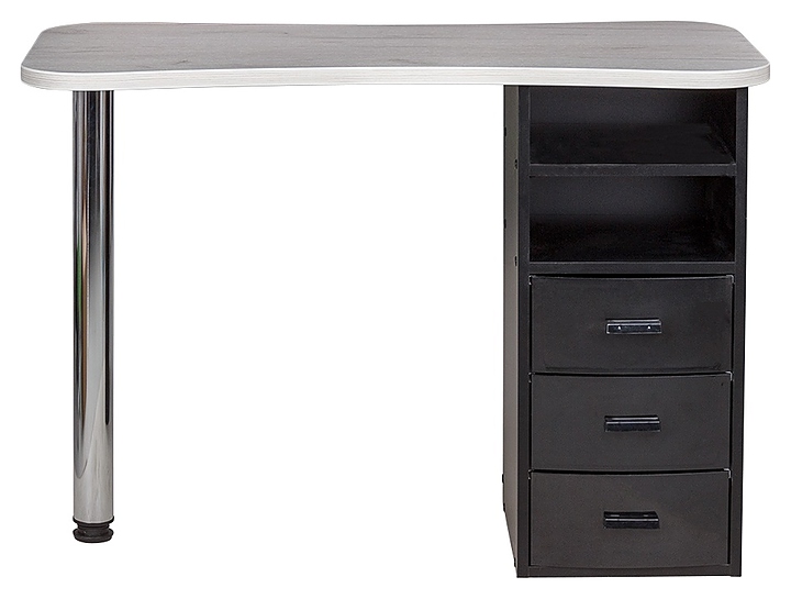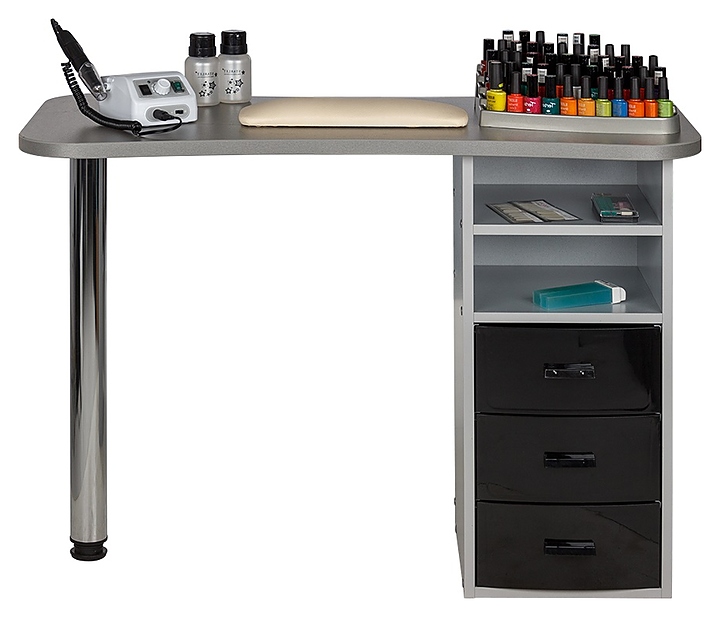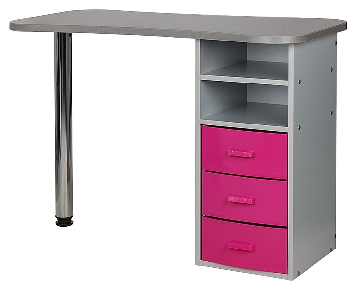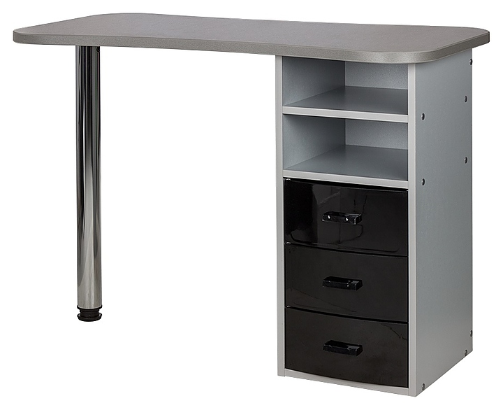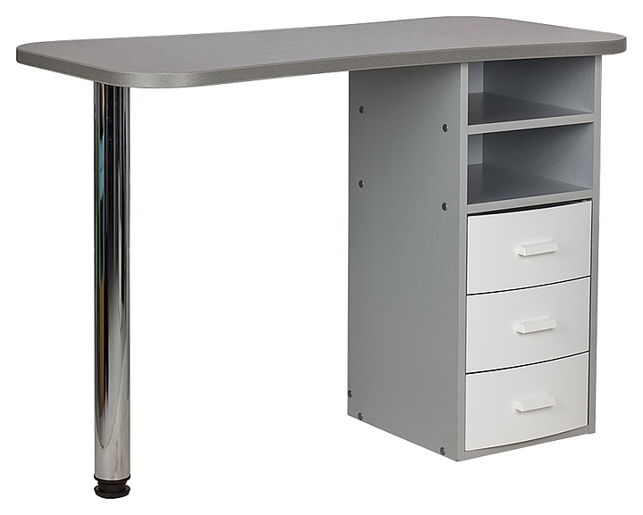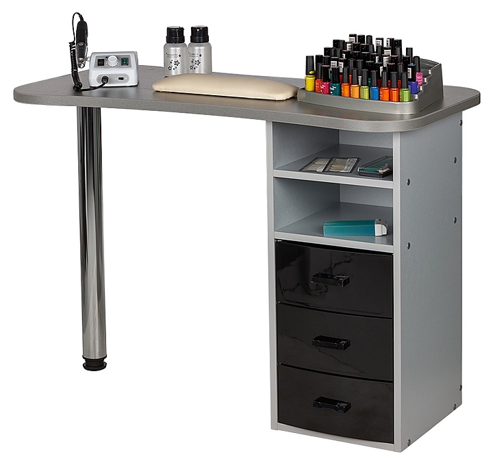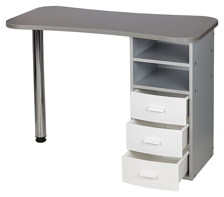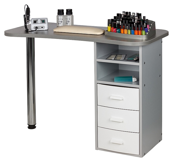 Маникюрный стол МЭДИСОН МАРИОН-3 с тремя ящиками предназначен для обустройства рабочего пространства мастера маникюра в косметологических центрах, салонах красоты и домашних студиях ногтевого сервиса. Модель оснащена столешницей, цилиндрической опорой на подпятнике и встроенной тумбой для хранения оборудования. Тумба укомплектована тремя выдвижными ящиками и открытым отделением с двумя полками. Столешница и тумба изготовлены из высококачественной ламинированной древесно-стружечной плиты с облицовкой влагостойкой меламиновой пленкой, опора – из хромированного металла, кант – из гибкого поливинилхлорида в цвет столешницы, ящики – из прочного пластика. Модель доступна в 14 альтернативных цветовых исполнениях ЛДСП, в 5 цветовых вариантах пластика ящиков, а также в комбинациях различных цветов. Особенности: