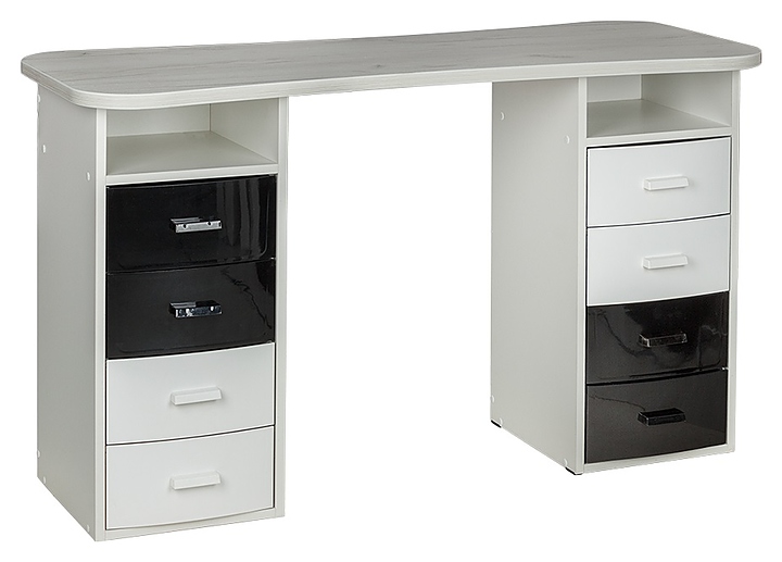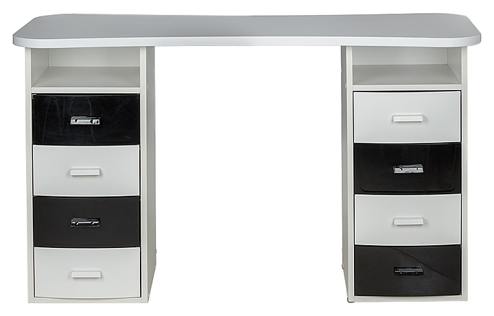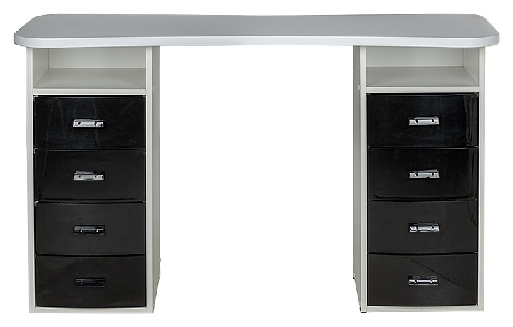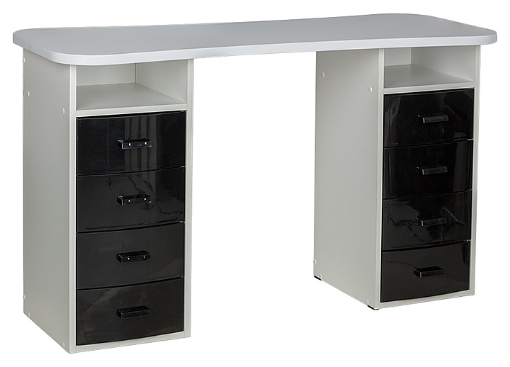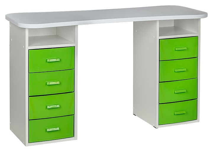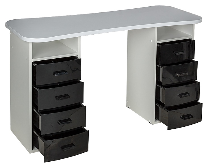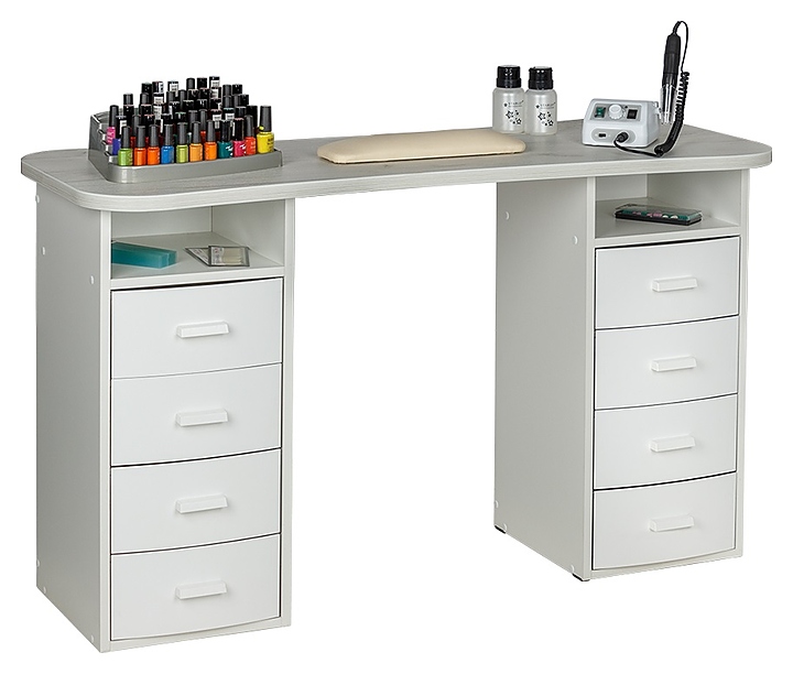Маникюрный стол МЭДИСОН ЭЛВУД-4 с восемью ящиками предназначен для обустройства рабочего пространства мастера маникюра в косметологических центрах, салонах красоты и домашних студиях ногтевого сервиса. Модель оснащена столешницей и двумя встроенными тумбами на подпятниках для хранения оборудования. Каждая тумба укомплектована четырьмя выдвижными ящиками и открытым отделением с одной полкой. Столешница и тумбы изготовлены из высококачественной ламинированной древесно-стружечной плиты с облицовкой влагостойкой меламиновой пленкой, кант – из гибкого поливинилхлорида в цвет столешницы, ящики – из прочного пластика.