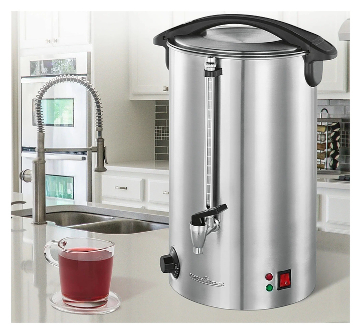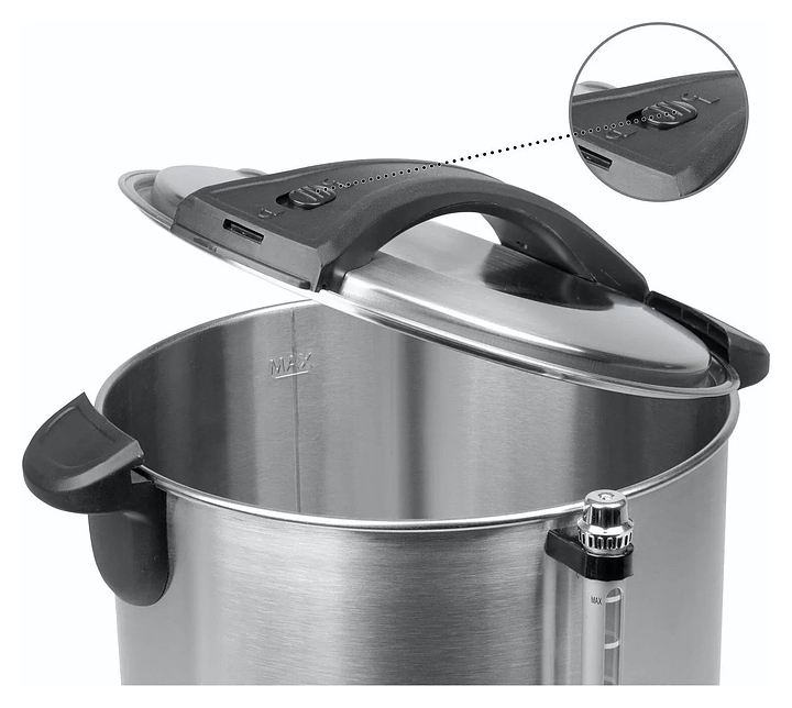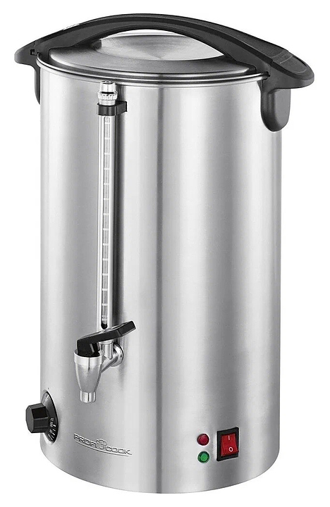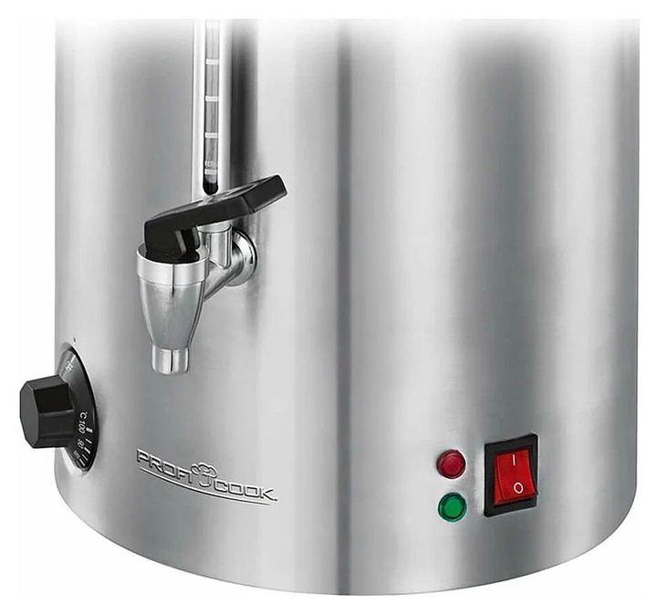 Термопот Profi Cook PC-HGA 1111 используется в квартирах, частных домах, кафе и ресторанах для нагрева и поддержания тепла большого количества воды или горячих напитков. Модель оснащена терморегулятором, 2 световыми индикаторами, запирающейся крышкой с термоизолированной ручкой и съемным сливным краном. Корпус и нагревательный элемент выполнены из нержавеющей стали, кран - цельнометаллический хромированный, ручки - из пластика. Особенности: