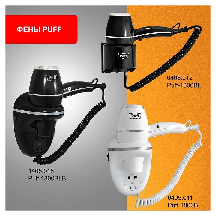 Настенный фен Puff 1800 предназначен для быстрой сушки и комфортной укладки в спорткомплексах, фитнес-центрах, бассейнах, отелях, гостиницах, частных домах и квартирах. Модель оснащена кнопкой включения и выключения, 2 режимами сушки по скорости и температуре. Корпус выполнен из ударопрочного Nylon-пластика. В комплект поставки входят крепления. Особенности: