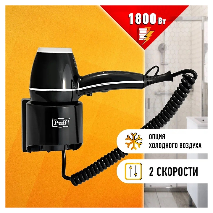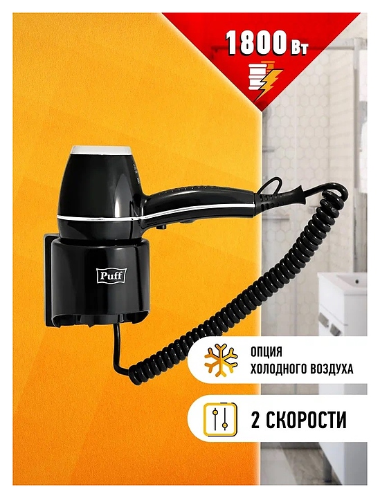 Настенный фен Puff 1800Вl предназначен для быстрой сушки и комфортной укладки в спорткомплексах, фитнес-центрах, бассейнах, отелях, гостиницах, частных домах и квартирах. Модель оснащена кнопкой включения и выключения, 2 режимами сушки по скорости и температуре. Корпус выполнен из ударопрочного Nylon-пластика.