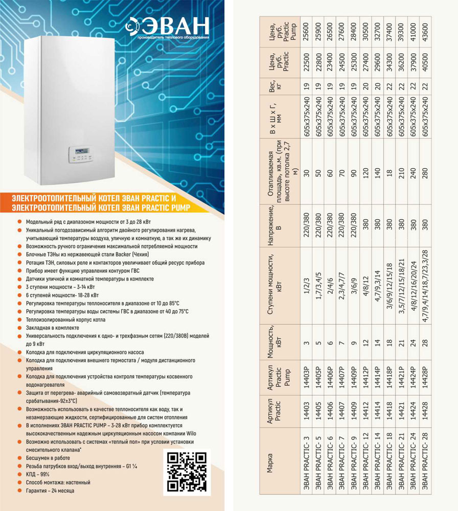 Отопительный котел ЭВАН PRACTIC PUMP-24 используется в коттеджах, частных домах и зданиях административно-бытового назначения для отопления помещений. Модель оснащена графическим дисплеем с интуитивно понятной навигацией по настройкам и режимам работы. В комплект поставки входят циркуляционный насос Wilo (закреплен в корпусе котла, но не встроен в контур отопления), датчик уличной температуры, датчик комнатной температуры и монтажная планка. Особенности:
