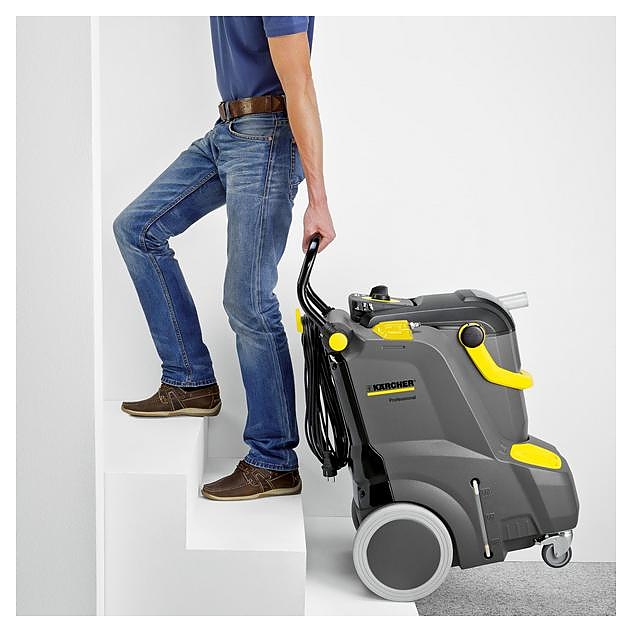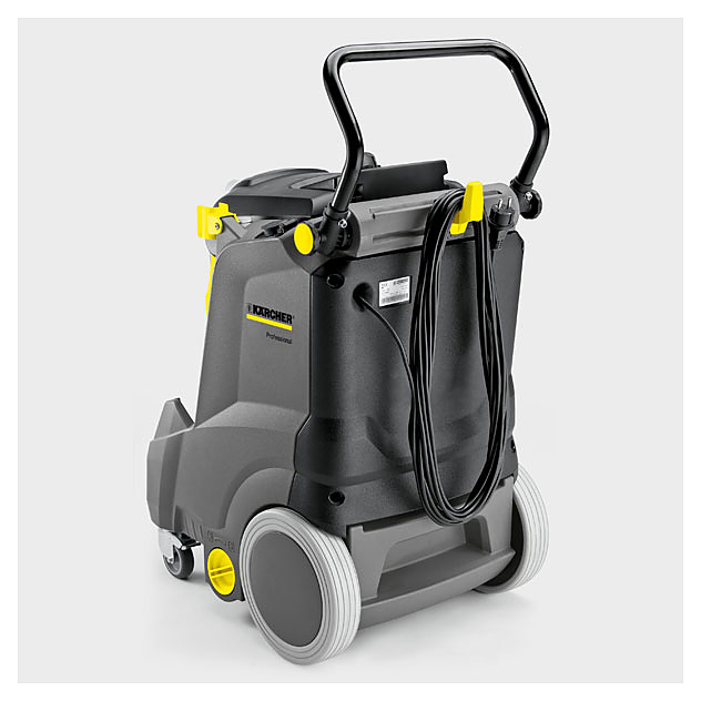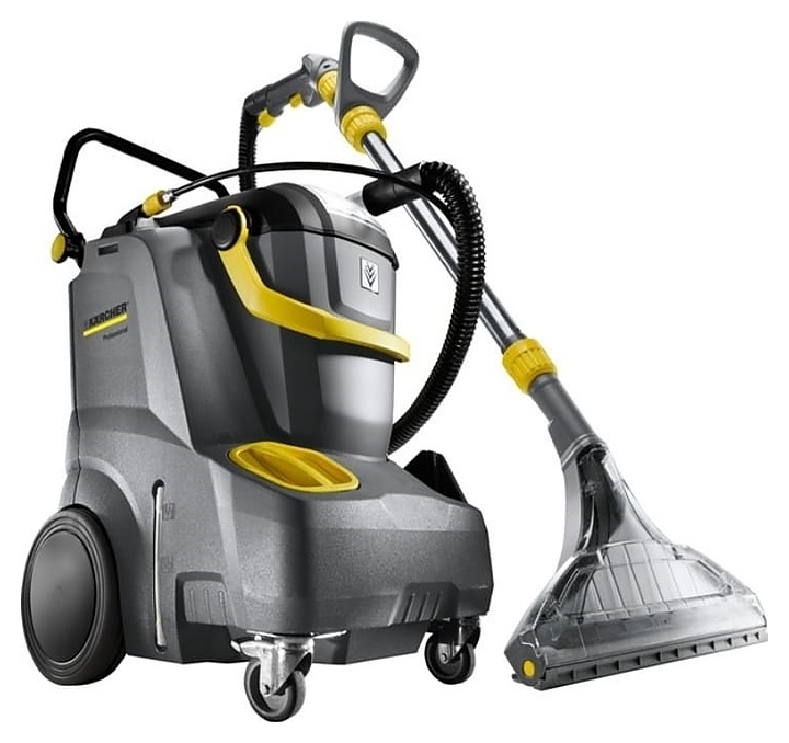 Профессиональный моющий пылесос Karcher Puzzi 30/4 E предназначен для влажной уборки твердых и текстильных напольных покрытий в помещениях офисов, гостиниц, торговых комплексов, вокзалов, кинотеатров, мастерских, предприятий общественного питания, а также для тщательной очистки транспортных салонов, мягкой мебели и ковров. Модель оснащена баками для моющего раствора и грязной жидкости, штепсельной розеткой для подключения щеточной головки, удобной рукоятью, крюком для кабеля и устойчивым четырехколесным шасси. Корпус и насадка изготовлены из ударопрочного пластика, удлинительная трубка – из хромированного металла. Комплектация: