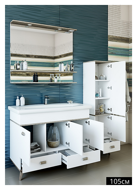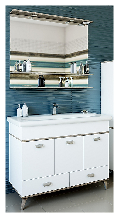 Гарнитур Sanflor Бруно выполнен в скандинавском стиле. Благодаря сочетанию простых и четких линий, природных цветов и материалов, мебель станет украшением любой ванной комнаты. В комплект входит тумба под раковину, раковина Kirovit Леонардо 105 и зеркало. Тумба оснащена 3 дверцами и 2 ящиками с механизмом плавного закрытия, зеркало - 2 полочками и LED-светильником. Раковина имеет одно отверстие для смесителя, расположенное по центру. Корпус мебели выполнен из влагостойкой ЛДСП. Особенности: