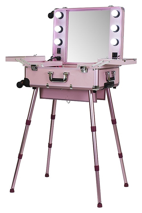 Мобильная студия Мэдисон&Co VZ-210 предназначена для хранения и транспортировки рабочих инструментов, приборов и расходных материалов мастера визажа в салонах красоты, косметологических центрах и на выездных сеансах. Модель оснащена запираемым на ключ транспортировочным кейсом с четырехколесным шасси и ручками для перемещения, трансформируемым в столик с раздвижными полочками, квадратным зеркалом, шестью светодиодными лампами, розеткой для электроприборов, кабелем питания и четырьмя складными телескопическими опорами. Корпус выполнен из качественного ударопрочного поливинилхлорида с металлическими угловыми накладками. В комплект поставки входит ключ. Модель доступна в 3 альтернативных цветовых исполнениях. Особенности: