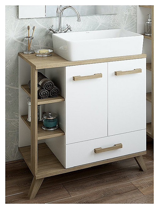 Тумба с раковиной Sanflor Ингрид 80 см правосторонняя, белая матовая, вяз швейцарский
