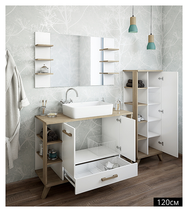 Тумба Sanflor Ингрид выполнена в ретро стиле. Благодаря яркому и харизматичному дизайну мебель станет украшением любой ванной комнаты. Тумба оснащена 2 дверцами, 1 ящиком с механизмом плавного закрывания и 6 открытыми полочками, а также накладной раковиной без отверстия под смеситель и перелива. Корпус мебели выполнен из ЛДСП с эмалевым покрытием. В комплект входит раковина Kirovit Олимпия 56. Тумба является частью гарнитура для ванной комнаты Ингрид. Особенности: