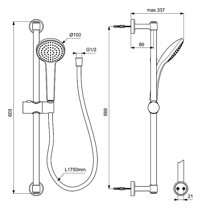 Душевой гарнитур Ideal Standard Idealrain BD142XG предназначен для использования в ванных комнатах. Изделие монтируется на стену. Штанга выполнена из латуни, отличающейся долговечностью и устойчивостью к коррозии, а шланг и лейка из прочного и легкого пластика. В комплект поставки входят шланг, лейка, штанга и слайдер. Особенности: