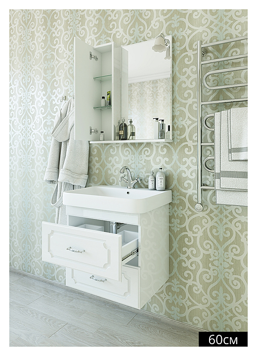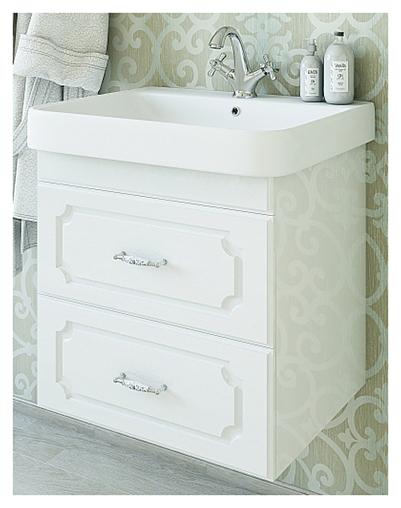 Тумба Sanflor Ксения выполнена в классическом стиле. Благодаря изысканному стилю мебель станет украшением любой ванной комнаты. Тумба оснащена 3 ящиками с механизмом плавного закрытия. Раковина имеет слив-перелив и одно отверстие для смесителя, расположенное по центру. Каркас выполнен из влагостойкой ЛДСП с эмалевым покрытием. В комплект входит раковина Santek Тигода 60. Тумба является частью гарнитура для ванной комнаты Ксения. Особенности: