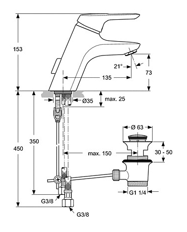 Смеситель для раковины Ideal Standard CERAMIX BLUE A5646 предназначен для использования в ванных помещениях для подачи горячей и холодной воды. Система монтажа Topfix позволяет установить модель над умывальником, что устраняет трудности работы в тесных и неудобных помещениях. Аэратор CASCADE насыщает водный поток воздухом и создает струю воды без брызг, при этом экономит расход воды. Функция HWTC контролирует максимальную температуру горячей воды, что исключает ожоги. В комплект поставки входит донный клапан. Особенности: