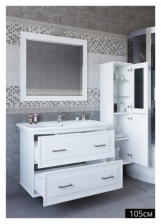 Гарнитур Sanflor Модена выполнен в классическом стиле. Благодаря четким линиям и олицетворению романского стиля мебель станет украшением любой ванной комнаты. В комплект входит тумба под раковину, раковина Kirovit Дуглас 105 и зеркало. Тумба оснащена 2 ящиками с механизмом плавного закрытия. Раковина имеет слив-перелив и одно отверстие для смесителя, расположенное по центру. Корпус мебели выполнен из влагостойкой ЛДСП с эмалевым покрытием. Особенности: