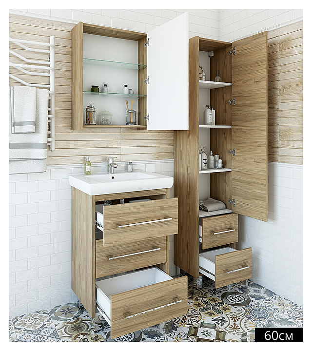 Гарнитур Sanflor Ларго выполнен в скандинавском стиле. Благодаря простоте и стильному внешнему виду мебель станет украшением любой ванной комнаты. В комплект входит тумба под раковину, раковина Kirovit Фостер 60, правостороннее зеркало и правосторонний пенал. Тумба оснащена 3 выдвижными ящиками с механизмом плавного закрытия, зеркало - шкафчиком. Раковина имеет слив-перелив и одно отверстие для смесителя, расположенное по центру. Пенал оснащен 1 дверцей, 3 деревянными полочками и 2 выдвижными ящиками. Корпус мебели выполнен из влагостойкой ЛДСП с эмалевым покрытием. Особенности: