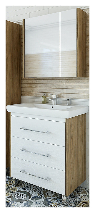 Гарнитур Sanflor Ларго выполнен в скандинавском стиле. Благодаря простоте и стильному внешнему виду мебель станет украшением любой ванной комнаты. В комплект входит тумба под раковину, раковина Kirovit Фостер 80 и правостороннее зеркало. Тумба оснащена 3 выдвижными ящиками с механизмом плавного закрытия, зеркало - шкафчиком. Раковина имеет слив-перелив и одно отверстие для смесителя, расположенное по центру. Корпус мебели выполнен из влагостойкой ЛДСП с эмалевым покрытием. Особенности: