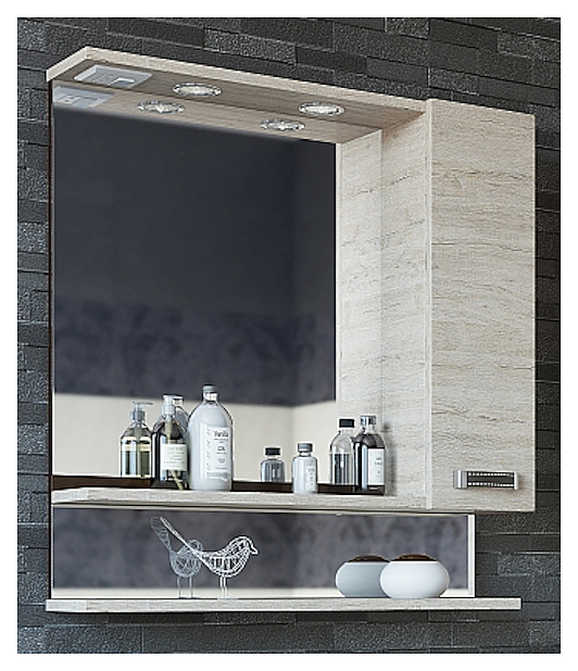 Зеркало Sanflor Техас выполнено в современном стиле. Благодаря функциональности и эргономичным формам мебель станет украшением любой ванной комнаты. Модель оснащена 1 шкафчиком, 2 открытыми полочками и подсветкой. Каркас выполнен из влагостойкой ЛДСП с эмалевым покрытием. Зеркало является частью гарнитура для ванной комнаты Техас. Особенности: