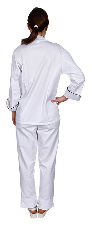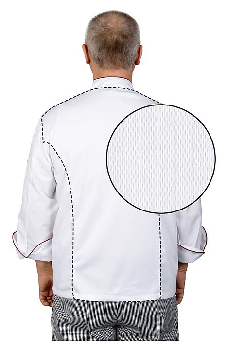 Куртка шеф-повара Клен 00012 Премиум используется поварами на предприятиях общественного питания и торговли. Модель оснащена застежкой на кнопках, сетчатой вставкой на спинке и манжетами на рукавах, декорирована цветным кантом. Изделие сшито из материала, состоящего на 35% из хлопка, на 65% из полиэстера. Фурнитура выполнена из нержавеющей стали, внутренние кнопки - никелированные. Куртка может использоваться вместе с универсальными брюками и сабо. Особенности: