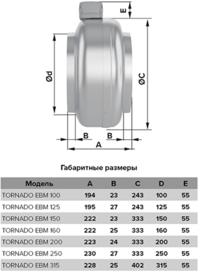 Центробежный канальный вентилятор ERA PRO TORNADO EBM 200 предназначен для приточно-вытяжной вентиляции помещений, жилых и общественных зданий. Модель оснащена однофазным двигателем с внешним ротором на шарикоподшипниках и центробежным рабочим колесом с назад загнутыми лопатками. Корпус выполнен из оцинкованной стали, лопатки - из пластика. Особенности: