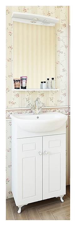 Гарнитур Sanflor Софи выполнен в классическом стиле. Благодаря плавным линиям и изысканному стилю мебель станет украшением любой ванной комнаты. В комплект входит тумба под раковину, раковина Rosa Элеганс 50 и зеркало. Тумба оснащена 2 дверцами и 2 полками, зеркало - полочкой и подсветкой. Раковина имеет одно отверстие для смесителя, расположенное по центру. Корпус мебели выполнен из влагостойкой ЛДСП. Особенности: