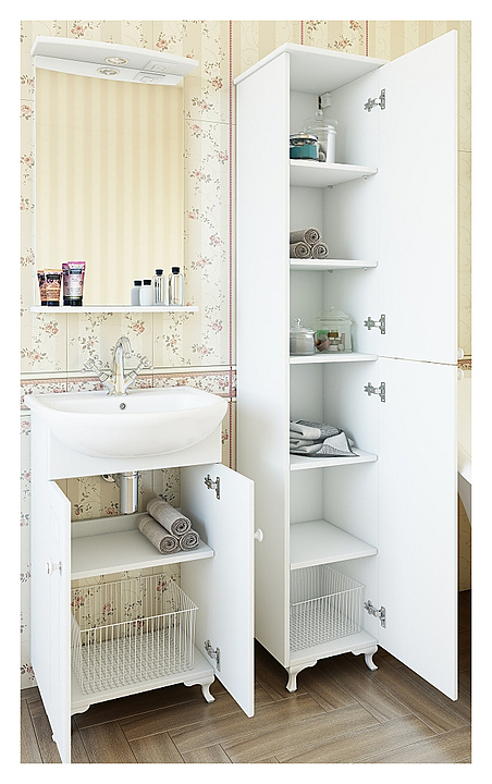 Гарнитур Sanflor Софи выполнен в классическом стиле. Благодаря плавным линиям и изысканному стилю мебель станет украшением любой ванной комнаты. В комплект входит тумба под раковину, раковина Rosa Элеганс 60, зеркало и правосторонний пенал. Тумба оснащена 2 дверцами и 1 выдвижным ящиком, зеркало - полочкой и подсветкой, пенал - 2 дверцами и 6 полками. Раковина имеет одно отверстие для смесителя, расположенное по центру. Корпус мебели выполнен из влагостойкой ЛДСП. Смеситель в комплект поставки не входит и приобретается отдельно. Особенности: