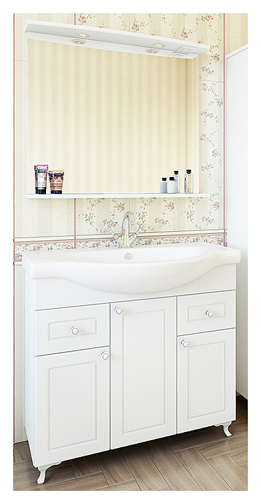 Гарнитур Sanflor Софи выполнен в классическом стиле. Благодаря плавным линиям и изысканному стилю мебель станет украшением любой ванной комнаты. В комплект входит тумба под раковину, раковина Kirovit Элеганс 85 и зеркало. Тумба оснащена 3 дверцами и 2 выдвижными ящиками, зеркало - полочкой и подсветкой. Раковина имеет одно отверстие для смесителя, расположенное по центру. Корпус мебели выполнен из влагостойкой ЛДСП. Особенности: