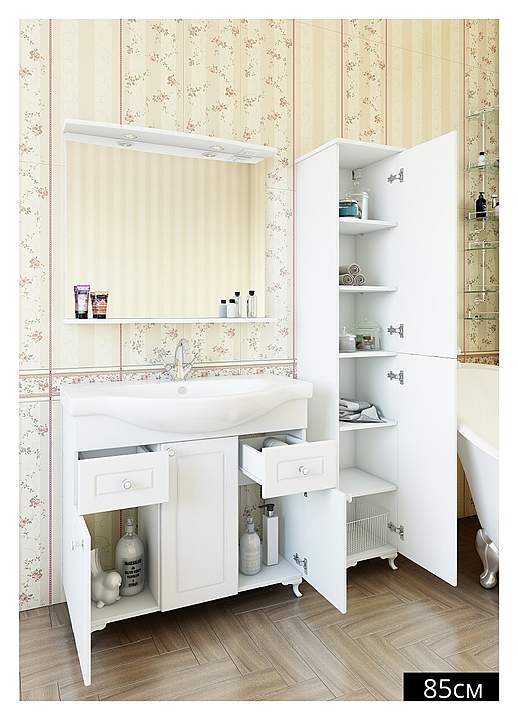 Гарнитур Sanflor Софи выполнен в классическом стиле. Благодаря плавным линиям и изысканному стилю мебель станет украшением любой ванной комнаты. В комплект входит тумба под раковину, раковина Kirovit Элеганс 85, зеркало и левосторонний пенал. Тумба оснащена 3 дверцами и 2 выдвижными ящиками, зеркало - полочкой и подсветкой, пенал - 2 дверцами и 6 полками. Раковина имеет одно отверстие для смесителя, расположенное по центру. Корпус мебели выполнен из влагостойкой ЛДСП. Особенности: