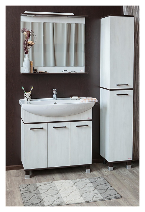 Гарнитур Sanflor Толедо выполнен в современном стиле. Благодаря четким линиям в сочетании с богатой текстурой мебель станет украшением любой ванной комнаты. В комплект входит тумба под раковину, раковина Kirovit Элеганс 85 и зеркало. Тумба оснащена 3 дверцами, зеркало - полочкой и подсветкой. Раковина имеет одно отверстие для смесителя, расположенное по центру. Корпус мебели выполнен из влагостойкой ЛДСП. Смеситель в комплект поставки не входит и приобретается отдельно. Особенности: