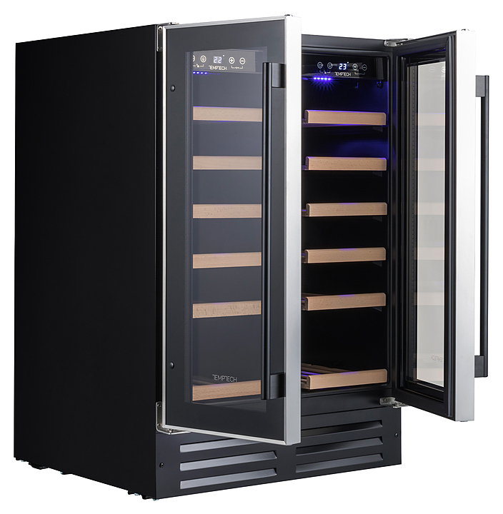 Винный шкаф Temptech Premium WP2DQ60DCB предназначен для охлаждения, хранения и демонстрации бутилированного вина в отелях, винных магазинах, на предприятиях общественного питания и торговли. Модель оснащена 2 камерами, сенсорными панелями с дисплеями для регулировки температуры и освещения, 12 выдвижными полками, 2 распашными дверцами, фильтром с активированным углем и синей светодиодной подсветкой. Дверцы выполнены из двухслойного стекла, заполненного аргоном, и с защитой от УФ-лучей, передняя панель - из черного стекла в тонкой стальной раме, полки - из бука. Особенности: