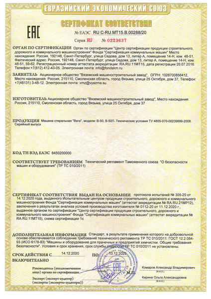 Стиральная машина Вязьма В-50П серии "Вега" используется в прачечных образовательных, оздоровительных заведениях, производственных предприятиях, в поликлиниках, гостиницах, детских садах, общежитиях, больницах, роддомах и воинских частях для стирки, полоскания и отжима белья, ткани и одежды. Благодаря низкому уровню остаточной влажности, исключается необходимость использования центрифуги. Внутренний и наружный барабаны изготовлены из нержавеющей стали, облицовки - из окрашенной стали. Особенности: