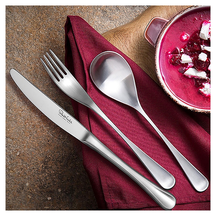 Набор столовых приборов ROBERT WELCH Stanton Satin используется на предприятиях общественного питания и торговли, а также в частных домах и квартирах. Изделия подходят для мытья в посудомоечной машине. Приборы изготовлены из специально закаленной нержавеющей стали 18/10 с матовой полировкой, чтобы режущая кромка была максимально тонкой. В комплект поставки входит 6 столовых ножей, 6 столовых вилок, 6 суповых ложек, 6 боковых ножей, 6 боковых вилок, 6 десертных ложек, 6 английских чайных ложек. Особенности: