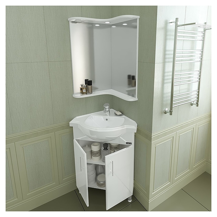 Тумба под раковину СаНта Аврора 60 дополнит интерьер ванной комнаты. Благодаря угловой конструкции модель сэкономит пространство в помещении и заполнит свободный угол. Модель оснащена 2 распашными дверцами, полкой и ножками, защищающими конструкцию от воздействия влаги в случае намокания пола. Корпус выполнен из влагостойкой ЛДСП, фасад - из МДФ и покрыт ПВХ-пленкой, что обеспечивает защиту поверхности от внешних воздействий и придает привлекательный внешний вид. Тумба используется вместе с угловой раковиной Классик. Комплектация: