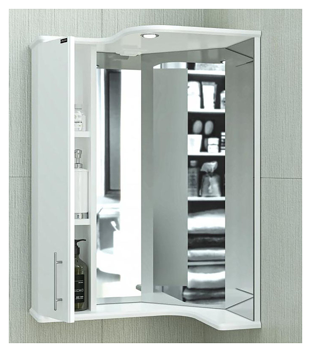 Зеркало СаНта Аврора 70 угловое свет дополнит интерьер ванной комнаты. Благодаря подвесной конструкции модель не занимает много места, что позволяет экономить пространство, а также облегчает уборку. Зеркало оснащено полочкой, шкафчиком и встроенным светильником с розеткой. Корпус выполнен из влагостойкой ЛДСП, фасад - из МДФ и покрыт ПВХ-пленкой, что обеспечивает защиту поверхности от внешних воздействий. Особенности: