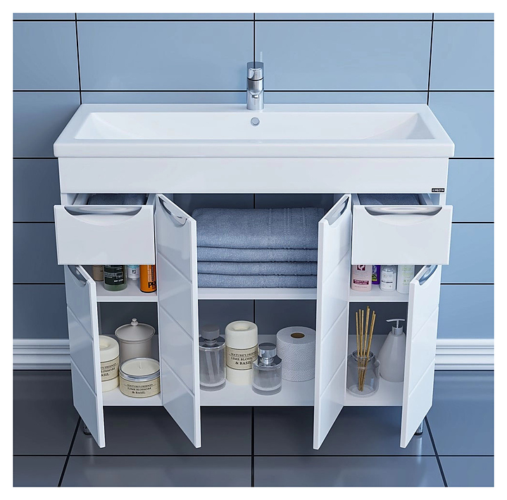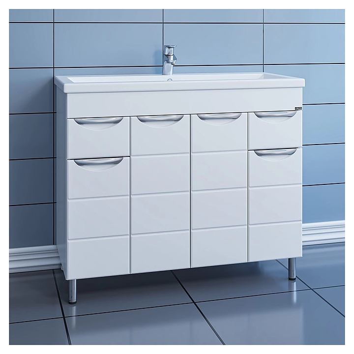 Тумба под раковину СаНта Родос 100 дополнит интерьер ванной комнаты. Модель оснащена 4 распашными дверцами, 2 выдвижными ящиками и ножками, защищающими конструкцию от воздействия влаги в случае намокания пола. Изделие выполнено из МДФ и покрыто ПВХ-пленкой для защиты поверхности от внешних воздействий. Тумба используется вместе с раковиной Фостер 100. В комплект поставки входят 6 ручек, 2 хромированные и 2 пластиковые ножки. Особенности: